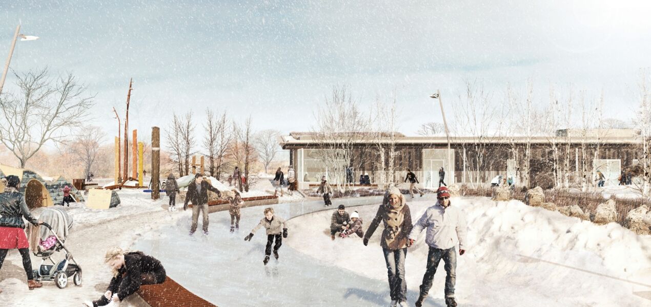The public Strata Park and Pavilion will be built on a private parking garage and will provide active use opportunities for Edgeley Pond and Park. The new park pavilion, also designed by DTAH, will include accessible restrooms, a community-use room and Zamboni enclosure will complement the skating loop, splash pad and unique play equipment designed by Earthscape. The pavilion will allow for events to be hosted throughout the year, bringing all-season programming to the park.