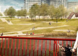 Parking garage access portals are integrated into the park and landscape. Playful mounds and thoughtfully placed shade trees will complement the Edgeley Pond and Park design to create a seamless integrated landscape. The park will be a destination for the Vaughan Metropolitan Centre and by residents of the new adjacent five-tower Expo City development.