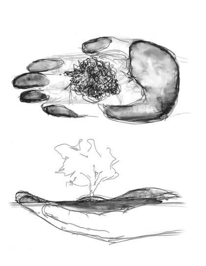 Named Nookomis Garden, the park design prioritizes Indigenous worldviews and relational views of land protection and features a large stone landform in the shape of an open palm - symbolizing the animism of the earth. In cradling a grove of planting within, it reminds us to care for nature.